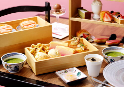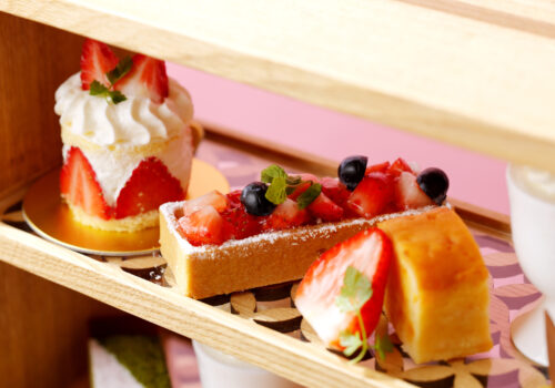 タルトフリュイルージュや抹茶のミルクレープ、エクレアフランボワーズなど初春を彩るスイーツや、蟹のタルトレットや林檎とフォワグラのサンドイッチなどセイボリーも充実の鮮やかなアフタヌーンティー。