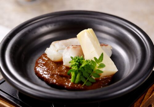 能登豚ブラックロースト 海老芋のコンフィとアリゴ添え
