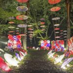 和傘と明かりを使用して鬼怒川公園森のエリアを鮮やかに彩ります。