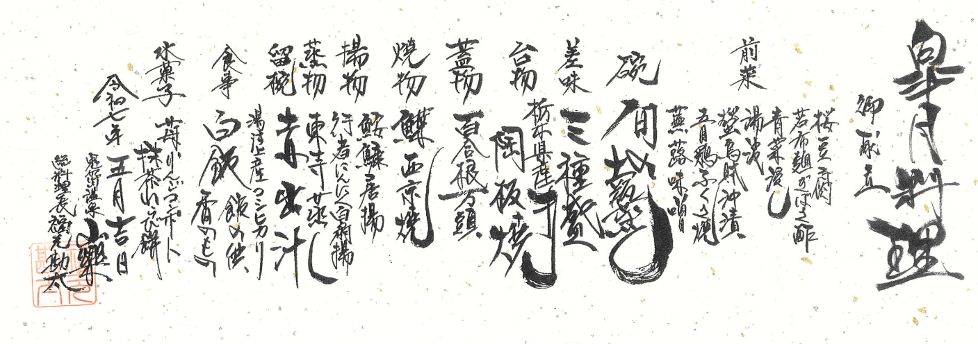 厳選した器に季節の食材を織り込み、味わい豊かにして、目にも麗しい創作料理に仕上げました。日本料理の伝統を大切にしながらも、形式にとらわれない斬新なアレンジを加えたこだわりのお献立をお楽しみくださいませ。温かいものを温かく、冷たいものは冷たいうちに、との繊細な心づくしでおもてなしいたします。