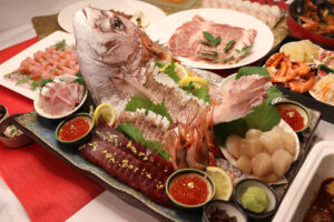 | メニュー一例 | さくらビーフのローストビーフ / 紅白ちらし寿司 / お造り / 国産豚とアサリのココット焼き / 鯛のポワレ / 鰻の蒲焼き / 近江黒鶏もも肉のオリーブ煮 など |