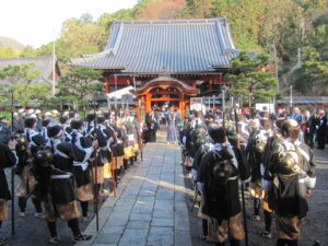 討ち入り装束に身を固めた区民の皆様による義士隊四十七士の行列が、毘沙門堂から大石神社まで練り歩きます。